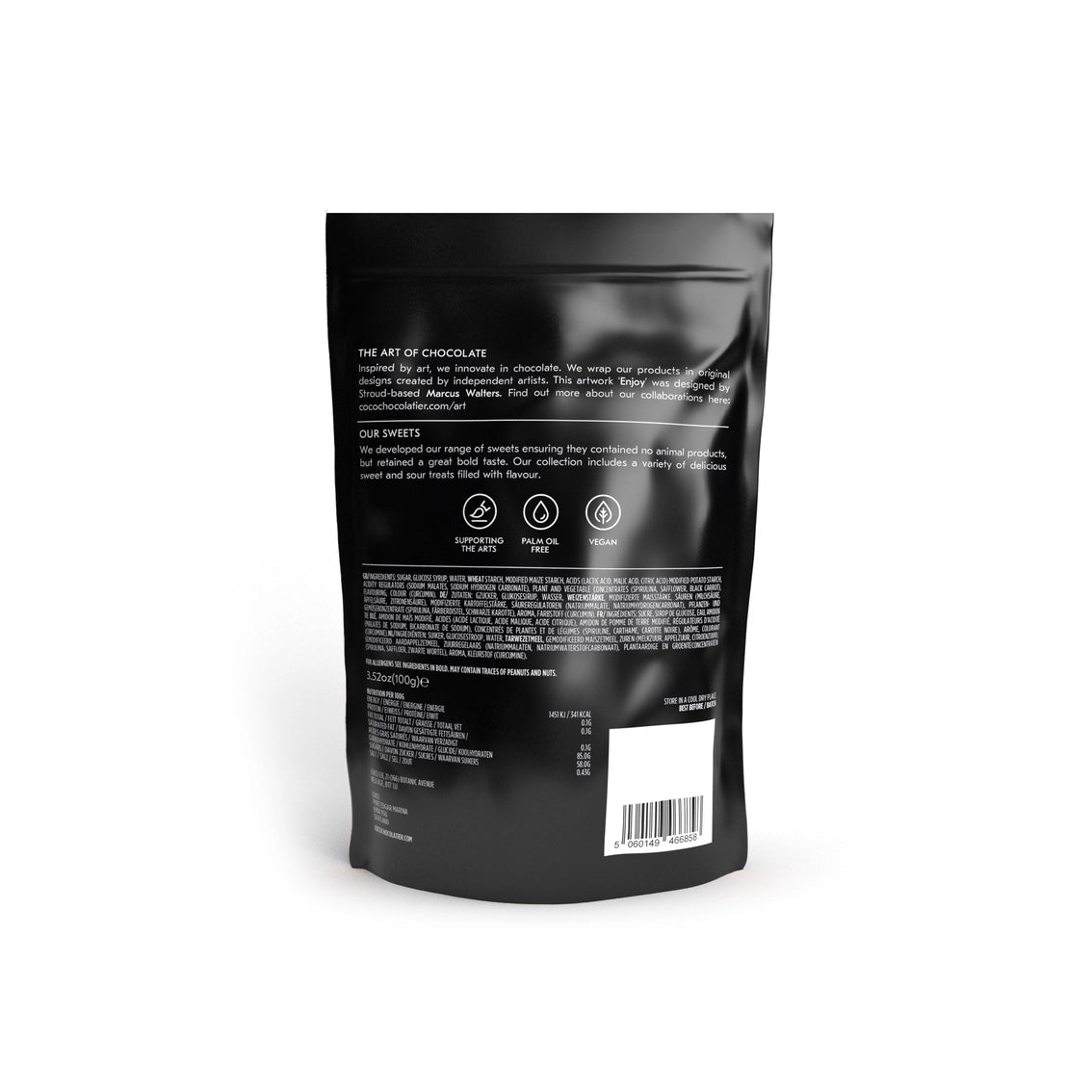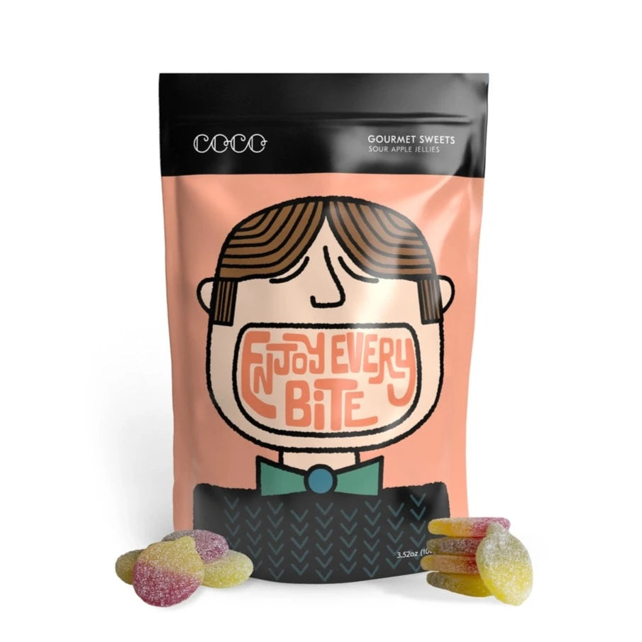 COCO's sour apples arrive to our funky range of sweets, bursting with fruit flavour and covered with a fizzy sugar coating, being delicious treats that are a perfect way to brighten up every moment of your day. The pouch contains 100g grams of delicious fruit flavoured jelly sweets that are both vegan and palm oil free. Artwork by Marcus Walters. Made in the U.K.