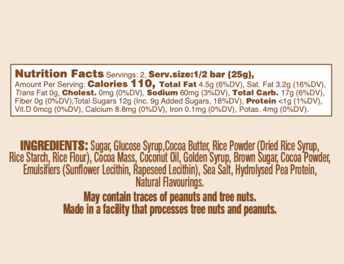 Ingredients: Sugar, Glucose Syrup,Cocoa Butter, Rice Powder (Dried Rice Syrup, Rice Starch, Rice Flour), Cocoa Mass, Coconut Oil, Golden Syrup, Brown Sugar, Cocoa Powder, Emulsifiers (Suntlower Lecithin, Rapeseed Lecithin), Sea Salt, Hydrolysed Pea Protein, Natural Flavourings. Contains soya. May contain traces of egg, milk, peanuts, and tree nuts.