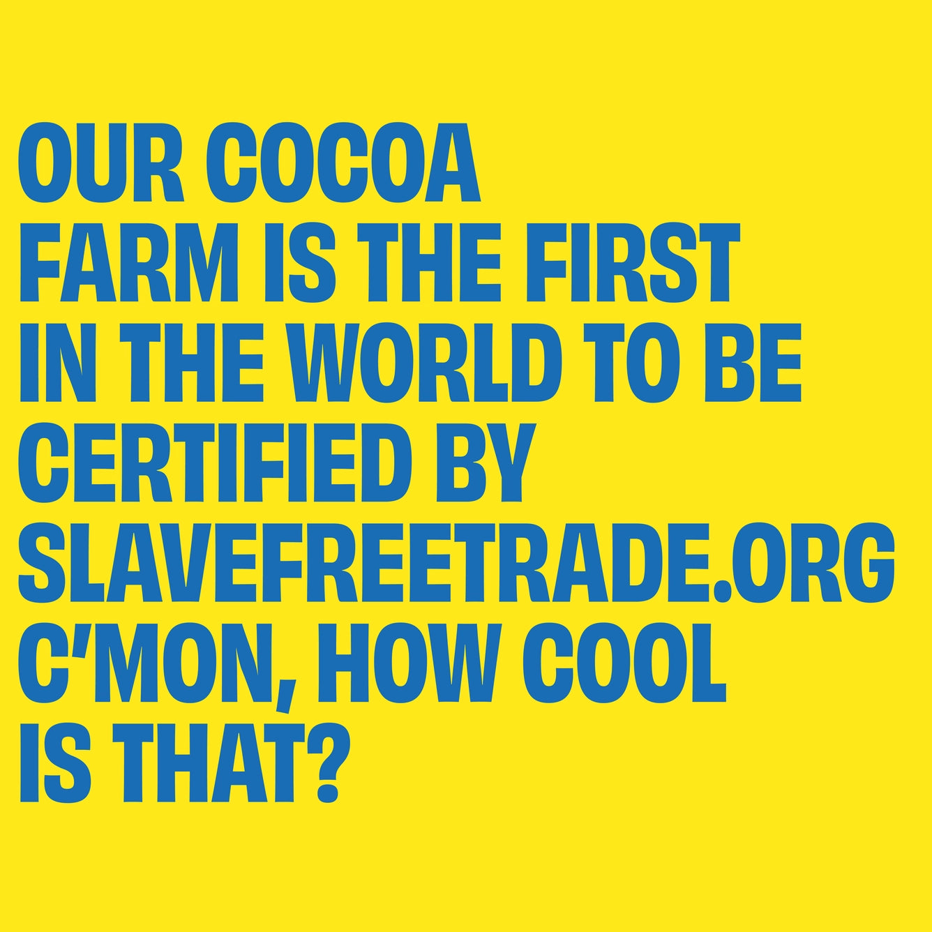 “100% CERTIFIED SLAVE-FREE COCOA IS ONLY A DREAM UNTIL IT'S NOT. WE THINK YOU SHOULD FEEL GOOD ABOUT THE CHOCOLATE YOU EAT AND THOSE WHO HELP MAKE IT. AND WE WON'T STOP UNTIL WE'VE TURNED THE WHOLE INDUSTRY UPSIDE DOWN. JOIN THE REVOLUTION.”
