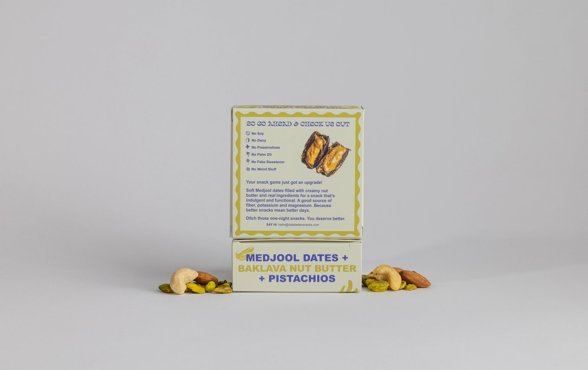Inspired by the classic Mediterranean dessert, our Baklava Dates deliver rich, nostalgic flavor in a modern, better-for-you snack. Soft Medjool dates are filled with a creamy blend of pistachio, cashew, and almond nut butter, layered with warm, aromatic Royal Cinnamon from Burlap & Barrel, then finished with dark chocolate. Sweet, nutty, and indulgent—without the sugar crash. <1g added sugar. Naturally sweet (no refined sugars). Gluten-free & plant-based. Made with single-origin, ethically sourced spices.