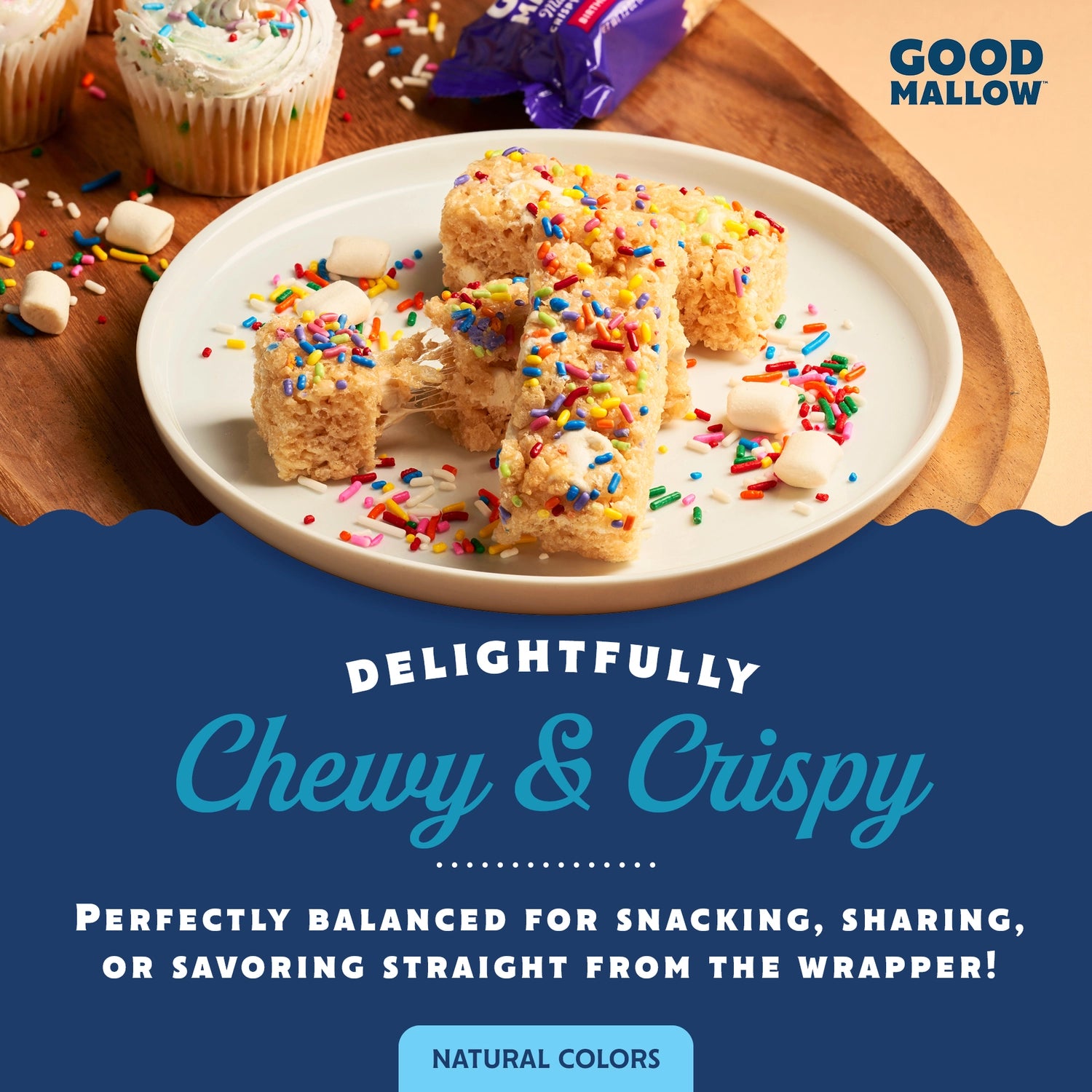 Meet GoodMallow Crispy Rice Treats – the soft, sweet, snackable bars made with our own plant-based marshmallows. These rice crispy treats are individually wrapped, totally dairy-free, and completely gelatin-free with no artificial dyes or flavorings. Just pure crispy-chewy joy in every bar.