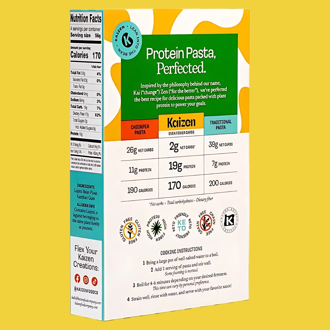 “When Arash started his 100 lbs weight loss journey, he thought pasta was off the menu forever. Other options were too high carb, and veggie noodles just weren’t cutting it. So, he and his wife, Madalina, created Kaizen—a game-changing, low carb pasta that’s also high-protein, gluten-free, and grain-free. Made with lupini and fava beans, it offers the taste and texture of traditional pasta but with 80-85% fewer carbs. Our low carb pasta is not only gluten-free and grain-free but also low glycemic and cooks in half the time of other options. Now, we’re on a mission to transform the carbs we consume, making them inclusive without compromise. It's time to put pasta back on the menu with our high-protein, gluten-free, and grain-free pasta.”