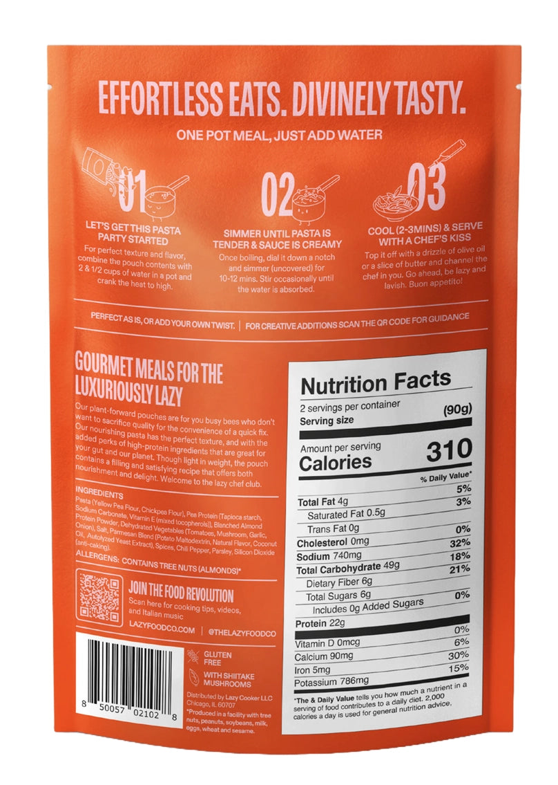 Ingredients: Pasta (Yellow Pea Flour, Chickpea Flour), Pea Protein (Tapioca starch, Sodium Carbonate, Vitamin E(mixed tocopherols)), Blanched Almond Protein Powder, Dehydrated Vegetables (Tomatoes, Mushroom, Garlic, Onion), Salt, Parmesan Blend (Potato Maltodextrin, Natural Flavor, Coconut Oil, Autolyzed Yeast Extract), Spices, Chili Pepper, Parsley, Silicon Dioxide (anti-caking).