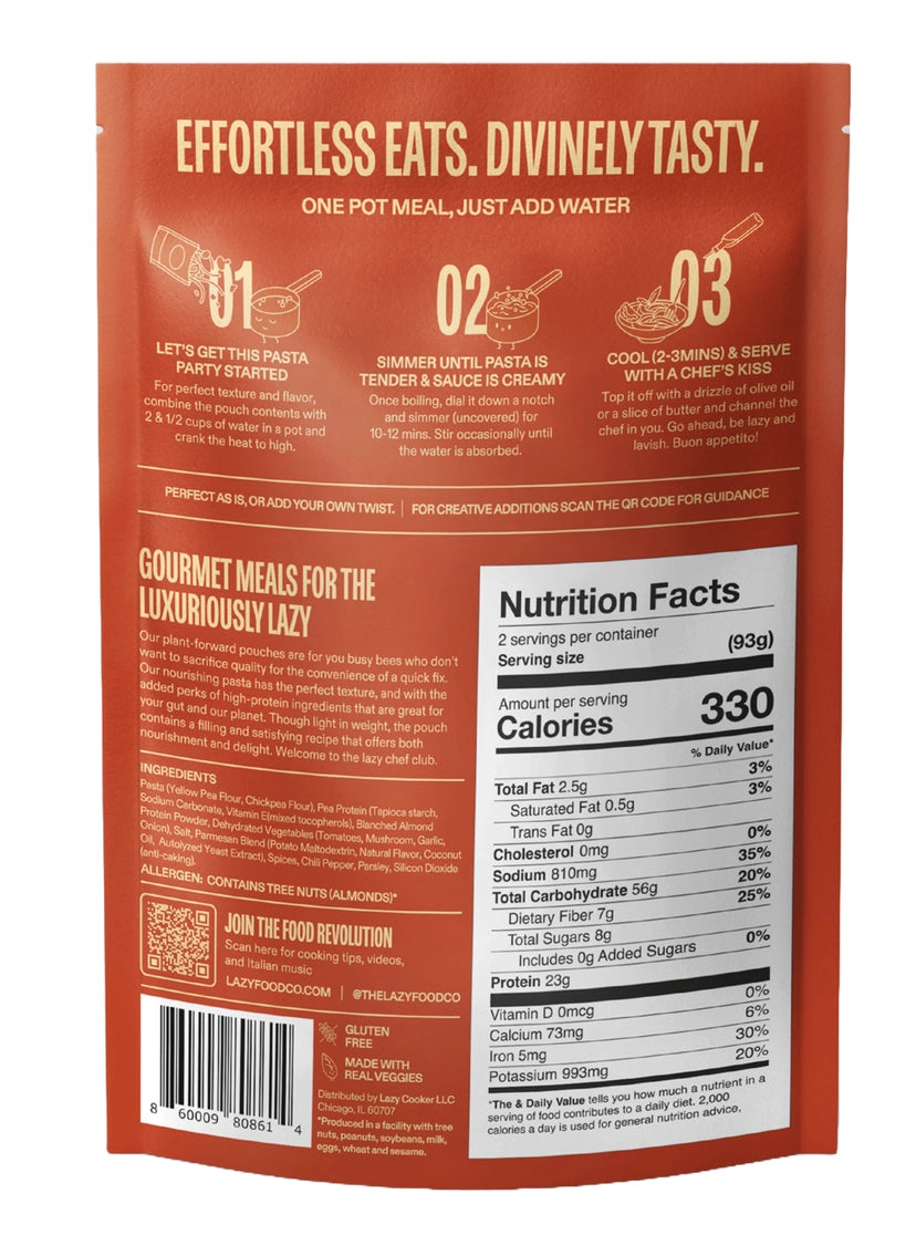 Ready in minutes, these meals are a true work of art. Created by our Sicilian chef. Your new healthy convenience. One pot, zero effort: just open, add water, and cook. Each package of pasta contains a whopping 46g of protein and is free from gluten and preservatives. Makes two European-sized servings.
