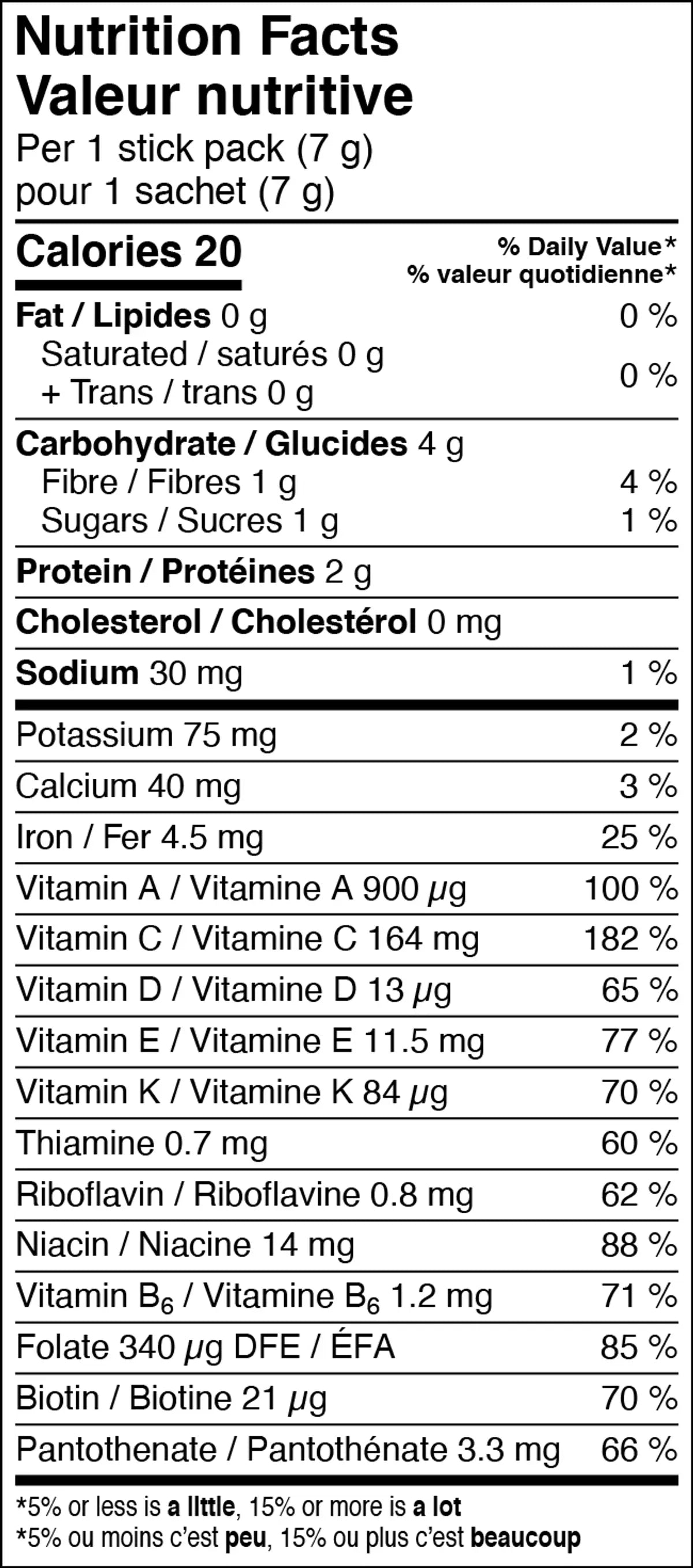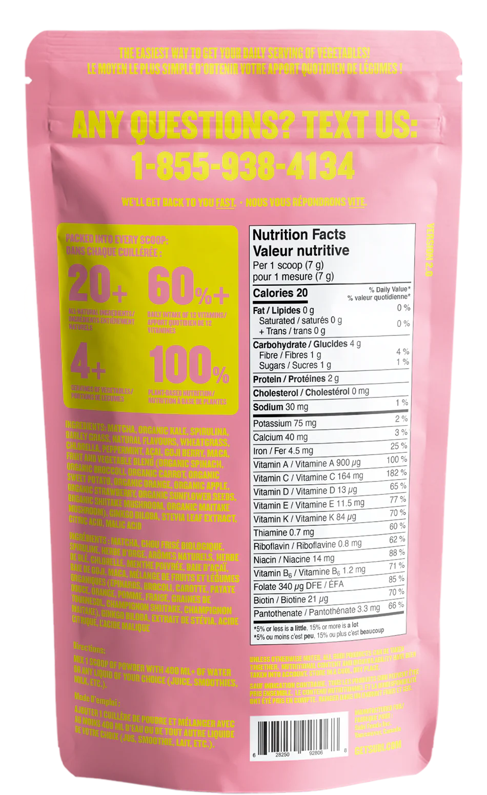 Ingredients: MATCHA, ORGANIC KALE, SPIRULINA, BARLEY GRASS, NATURAL FLAVOURS, WHEATGRASS, CHLORELLA, PEPPERMINT, AÇAI, GOJI BERRY, MACA, FRUIT AND VEGETABLE BLEND (ORGANIC SPINACH, ORGANIC BROCCOLI, ORGANIC CARROT, ORGANIC SWEET POTATO, ORGANIC ORANGE, ORGANIC APPLE, ORGANIC STRAWBERRY, ORGANIC SUNFLOWER SEEDS, ORGANIC SHIITAKE MUSHROOM, ORGANIC MAITAKE MUSHROOM), GINKGO BILOBA, STEVIA LEAF EXTRACT, CITRIC ACID, MALIC ACID.